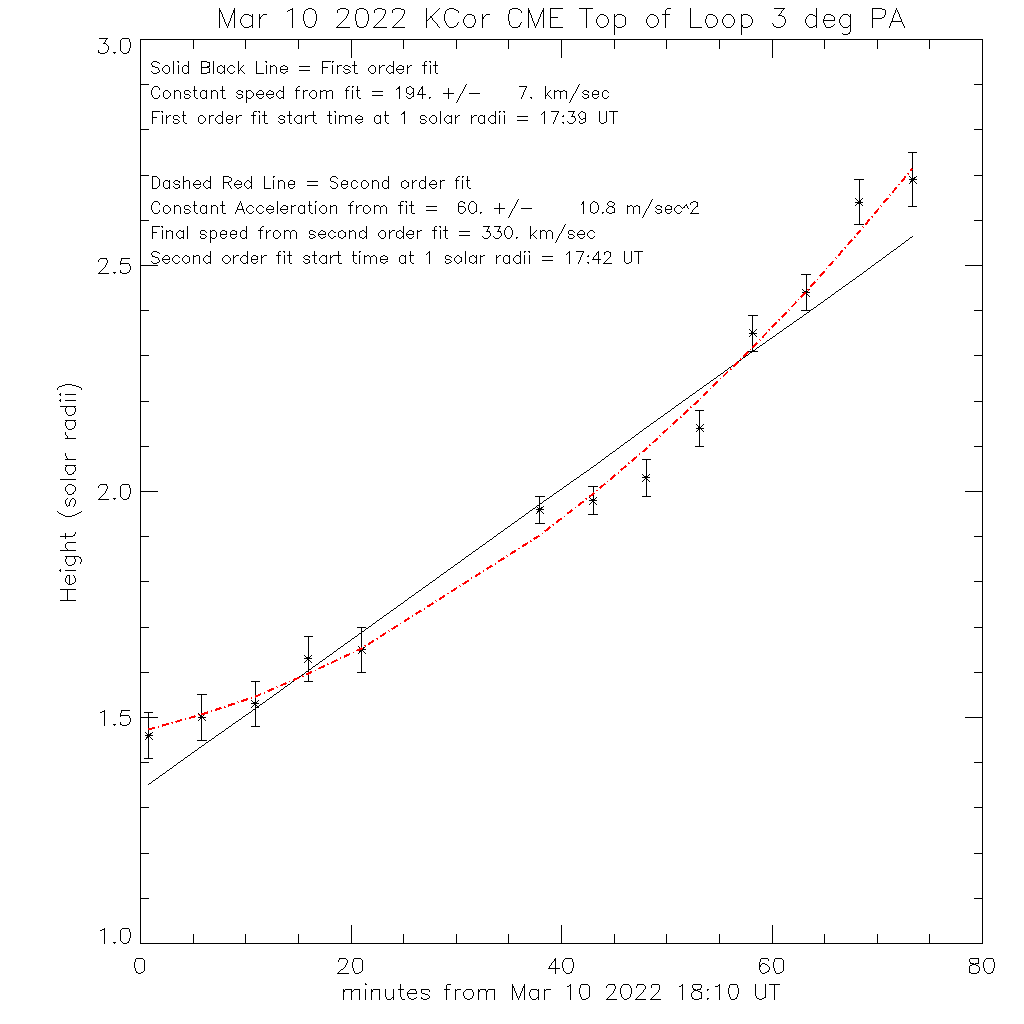 On March 10, 2022 at ~17:41 a CME was seen emerging over the north pole in K-Cor white light coronal observations as illustrated in the K-Cor subtraction movies above (with additional links at bottom of page). The loop-shaped CME accelerated through the K-Cor field-of-view (FOV) reaching a speed of 330 km/sec and an acceleration of 60 m/s2 by 19:24 UT at a height of 2.7 solar radii as shown in the time vs. height plot. The CME widened as it accelerated outward. The CME width was measured at 1.7 solar radii. It increased from ~53 degrees wide at 18:48 UT to ~66 degrees at 19:24 UT.