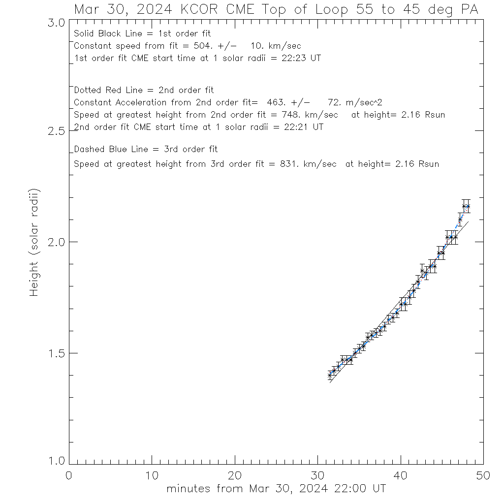 The Mauna Loa K-Coronagraph observed this CME on March 30, 2024. This CME is accelerating rapidly in the KCor field of view. The last observation was taken at 22:48:09 UT when the CME was at 2.16 solar radii. The best fit to the trajectory (see plot below) was the 2nd order fit which gave an acceleration of 463 +/- 72 m/s2 and a speed of 748 k/s at 2.16 solar radii. This CME was observed by LASCO as a partial halo and shows a deceleration of -2.6 m/s2 in LASCO.