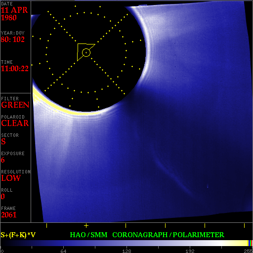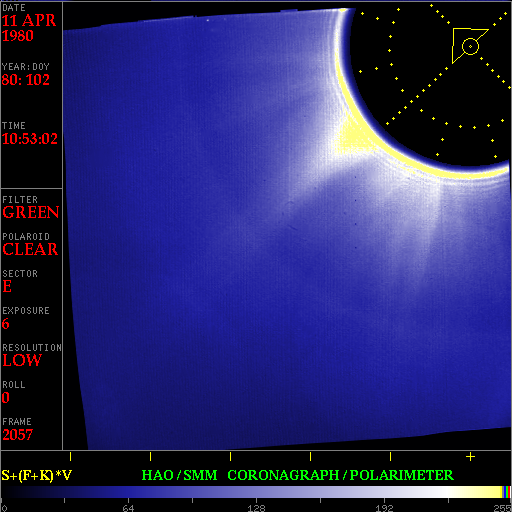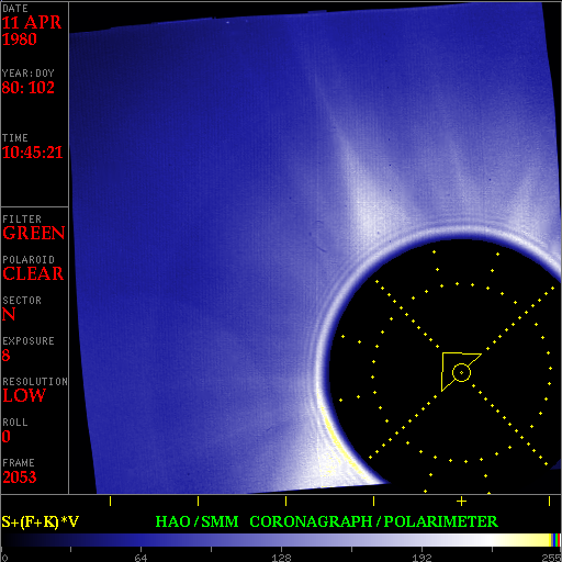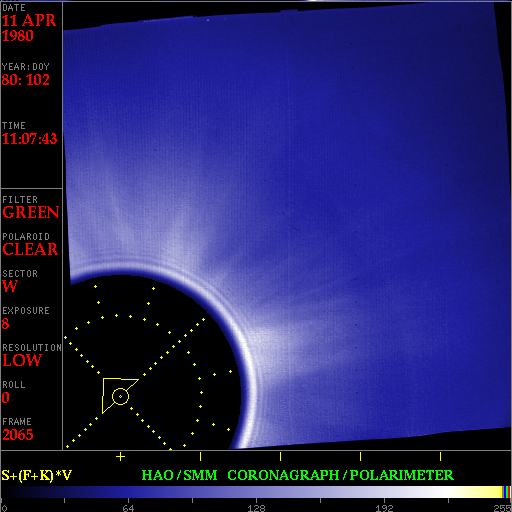 The Solar Maximum Mission Coronagraph/Polarimenter was designed & operated by the High Altitude Observatory, a division of the National Center for Atmospheric Research, and funded by the National Science Foundation. The SMM Coronagraph/Polarimeter instrument was built by Ball Aerospace Systems Division. The SMM Spacecraft was built by Goddard Space Flight Center, and the SMM project was funded & managed by the National Aeronautics & Space Administration.