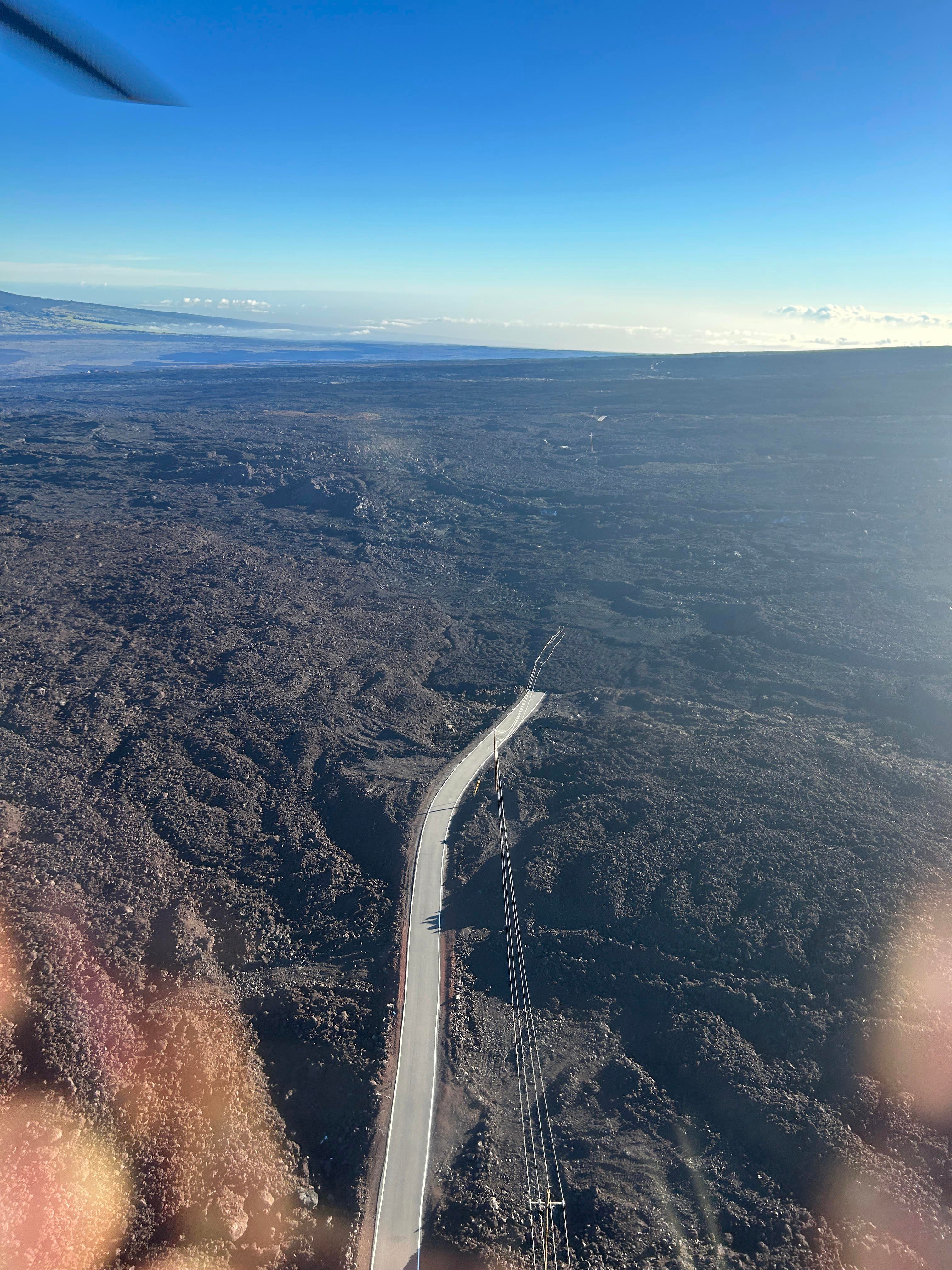 A team from NOAA flew to the Mauna Loa observatory to assess conditions at the observing site and to estimate the length and height of lava covering the Mauna Loa access road. The facility looks to be in good shape. This picture was taken from the helicopter by the NOAA team; the Mauna Loa Solar Observatory is shown in red. It has snowed at the site, which is common in winter. The second photo shows lava flows from fissure 3 destroyed approximately a mile of the road and power lines. NOAA will be informed when the lava is cool enough for repairs to begin. Photos courtesy NOAA.