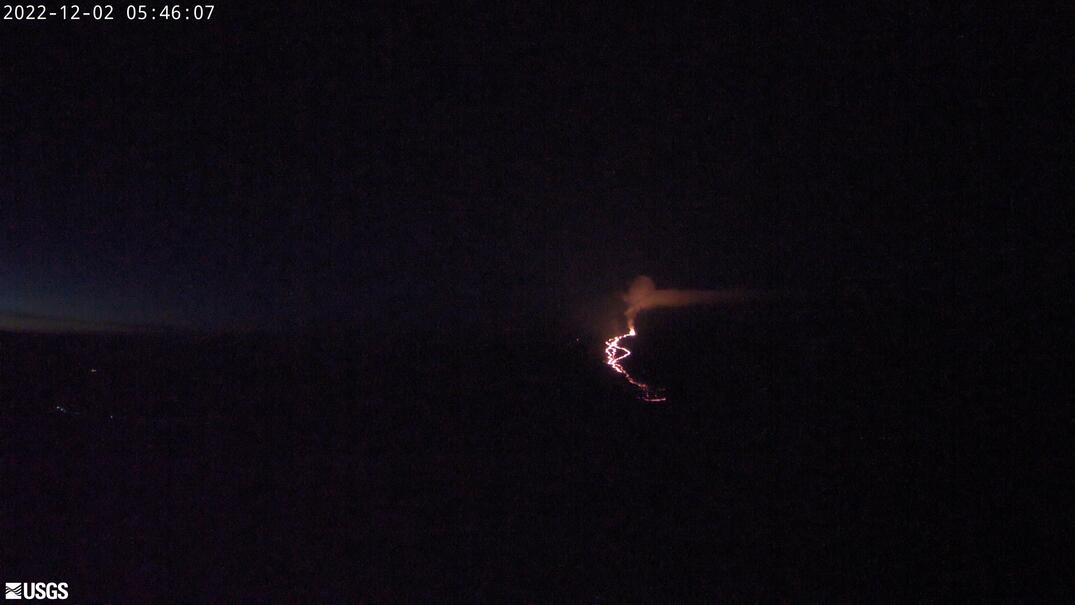 USGS webcam image from Dec 1 at 06:06 AM Hawaii time from Mauna Kea shows the lava flows continuing in the northeast rift zone on Mauna Loa flowing downslope toward the Saddle Road.12/1/2022:
