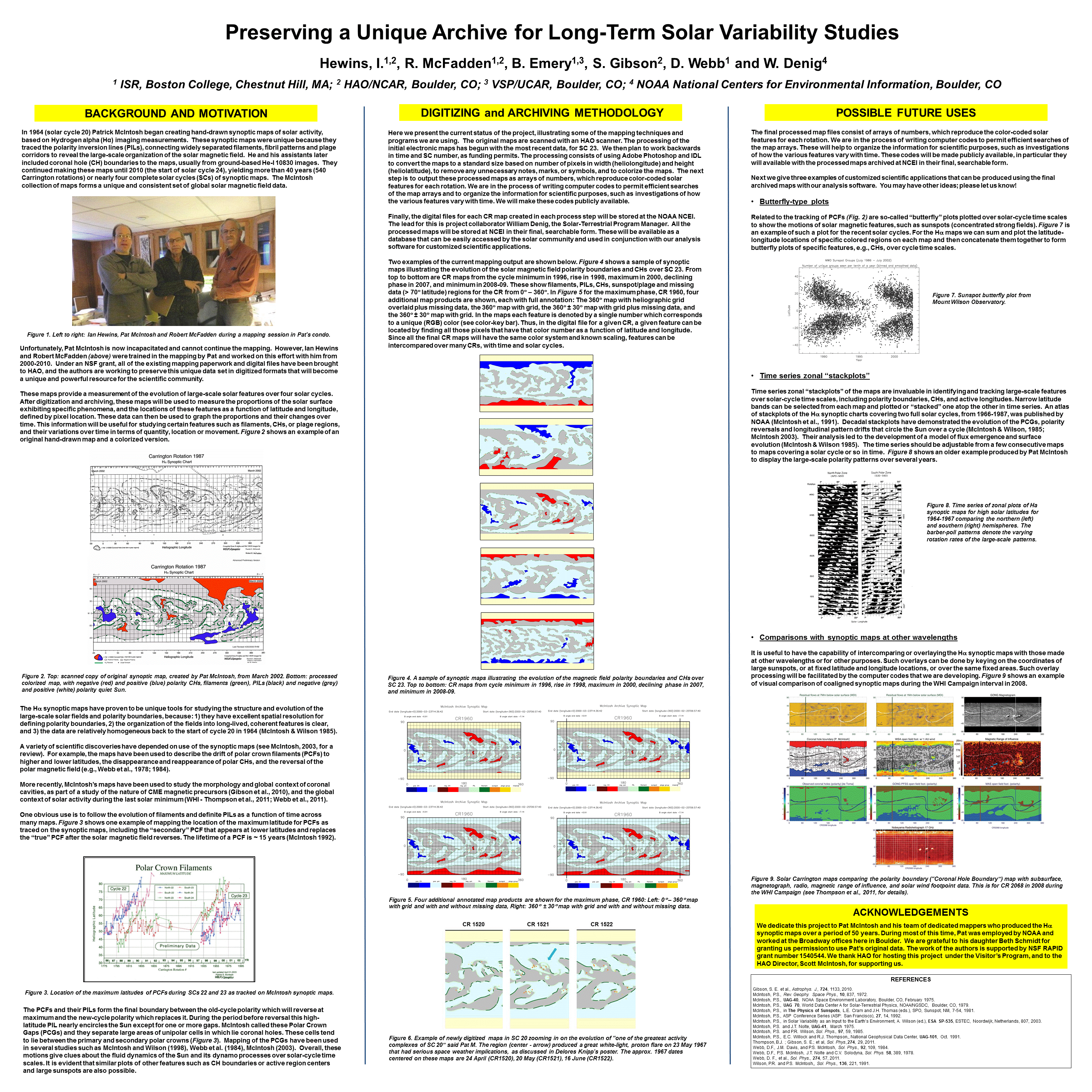 Gibson, S., D. Webb, I. Hewins, R. McFadden, B. Emery, W. Denig and P. McIntosh (2017), Beyond Sunspots: Studies Using the McIntosh Archive of Global Solar Magnetic Field Patterns, Living Around Active Stars; Proceedings IAU Symposium 328, p. 93, D. Nandy, A. Valio & P. Petit, eds., Cambridge Univ. Press, Cambridge, UK. DOI: 10.1017/S1743921317003726. - Webb et al., Space Weather, 15, 1442, 2017.